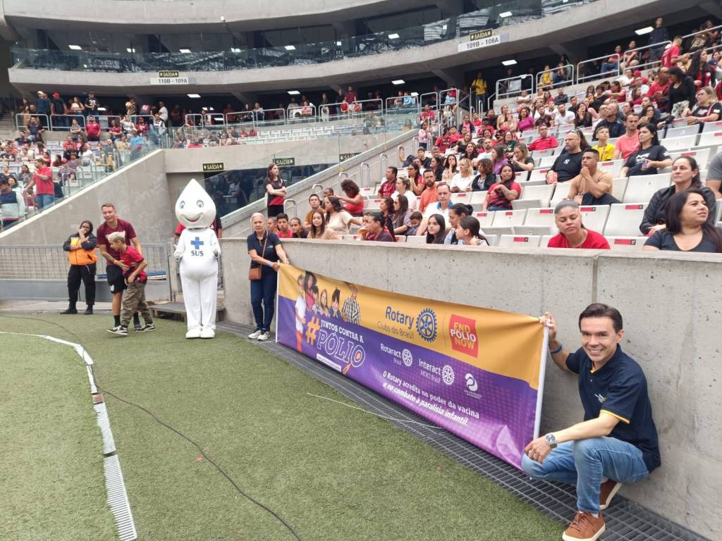 Nas telas de todo o estádio foi transmitido o vídeo institucional sobre o trabalho da Fundação Rotária em favor da erradicação da Poliomielite.
