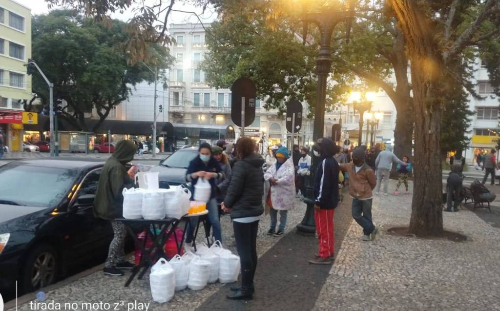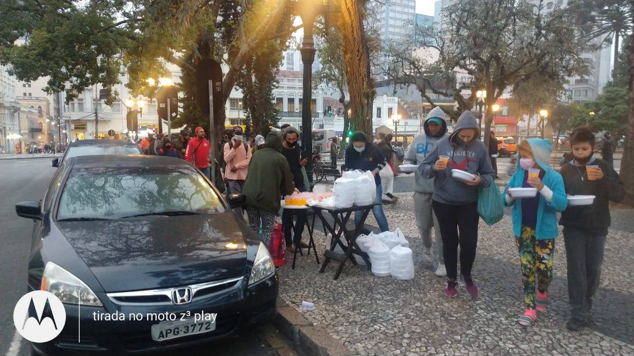 ROTARY CLUB DE CURITIBA: Ação solidária e de voluntariado dos associados Mariana Viaro, Juçara Gava e Luis Carlos Bitencourt na distribuição de marmitas, sanduíches e sucos a vulneráveis, desempregados e carentes, em consequência da pandemia do coronavírus. Local: Praça Tiradentes, ao lado da Catedral Metropolitana de Curitiba/Pr., por volta das 17h30.