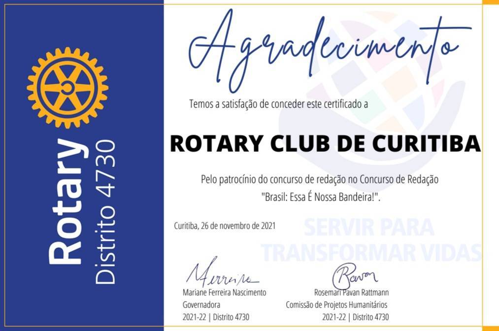 Na semana passada, o Concurso “Brasil: Essa é a nossa bandeira” encerrou a edição deste ano premiando os participantes na sede do Distrito 4730. O objetivo é aumentar a conscientização política e social dos estudantes de Ensino Fundamental, ampliando o conhecimento sobre direitos e deveres do cidadão. Além dos 07 Rotary Clubs do Distrito 4730 que participaram da execução do projeto, promovendo a participação de escolas e estudantes, o projeto contou com patrocinadores, e o concurso "Brasil, esta é a nossa bandeira" premiou as dez melhores redações. Os patrocinadores e/ou apoiadores do projeto foram: Rotary Club de Curitiba; Rotary Club de Curitiba Bom Retiro; Rotary Clube de Curitiba III Milênio; Rotary Clube de Curitiba Mercês; Rotary Club de Curitiba Rebouças; Rotary Club de Palmeira; Rotary Club de Ponta Grossa - Campos Gerais; alumni Elisa Schmidilin Cruz, rotarianas Denise Schmidilin Cruz e Marcia Schilting; e voluntário Amilton Carlos Rattmann.