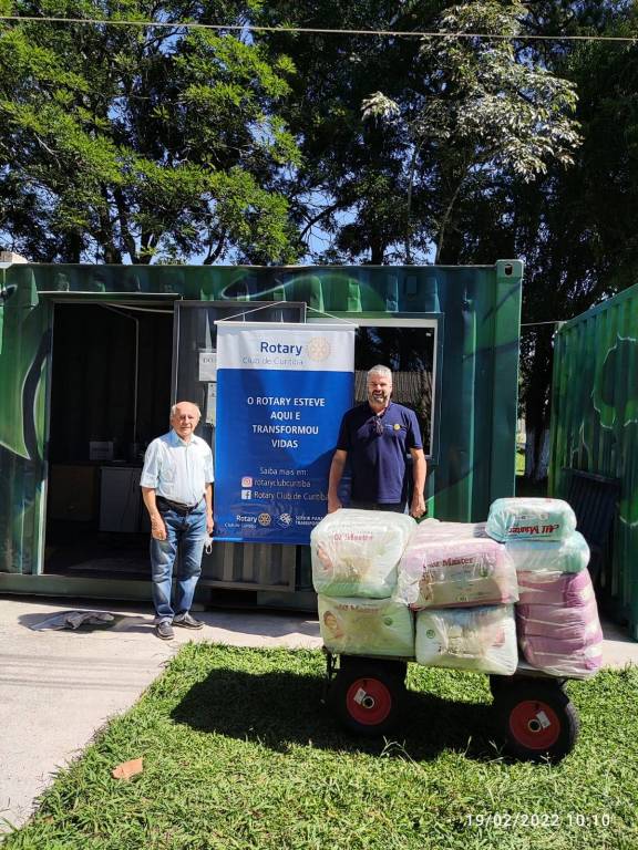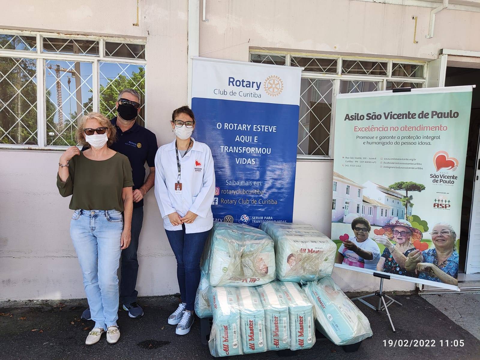 Em atendimento ao chamado pela mídia televisiva local de solicitação de ajuda para doação de fraldas geriátricas para duas casas de idosos de Curitiba – São Vicente de Paula, onde residem 150 idosas, e Recanto do Tarumã, com 100 idosos, neste período do mês de janeiro e fevereiro onde os estoques de doações estão mais baixos, o RC de Curitiba mobilizou-se e deliberou pela ajuda na compra de fraldas geriátricas para as duas instituições. Importa destacar que o RC de Curitiba esteve diligenciando junto ao RC Imigrantes e RC de Ponta Grossa informações para a viabilidade da aquisição de máquina para a confecção de fraldas geriátricas, uma vez que estes dois Clubes já possuem referido equipamento. Todavia, revelou-se inviável financeiramente a sua aquisição, bem como complementa o companheiro José Rendak, um dos responsáveis pelo Recanto Tarumã, que o manuseio da máquina requer pessoa capacitada (responsável técnico), externa ao quadro de asilados e funcionários da instituição, conforme as determinações da Secretaria da Saúde (Vigilância Sanitária).