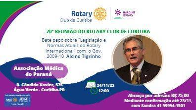 Na próxima 5a feira, as 12h, o Rotary Club de Curitiba recebe o Gov. 2009-10 Alcino Tigrinho num bate papo sobre Legislação e Normas Atuais do Rotary Internacional. Participe! Almoço por adesão a R$ 75,00, na Associação Médica do Paraná, R. Candido Xavier, 575 - Água Verde, Curitiba-PR. Reservas pelo 41 99994-1501.