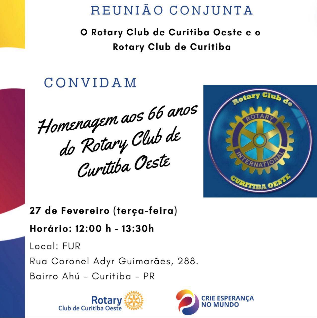 REUNIÃO CONJUNTA: ROTARY CLUB DE CURITIBA (Presidente Fabiano Reche dos Reis, 23-24) e ROTARY CLUB DE CURITIBA OESTE (Presidente Viviane Monteiro Góes, 23-24). Homenagem aos 66 anos do Rotary Club de Curitiba Oeste.