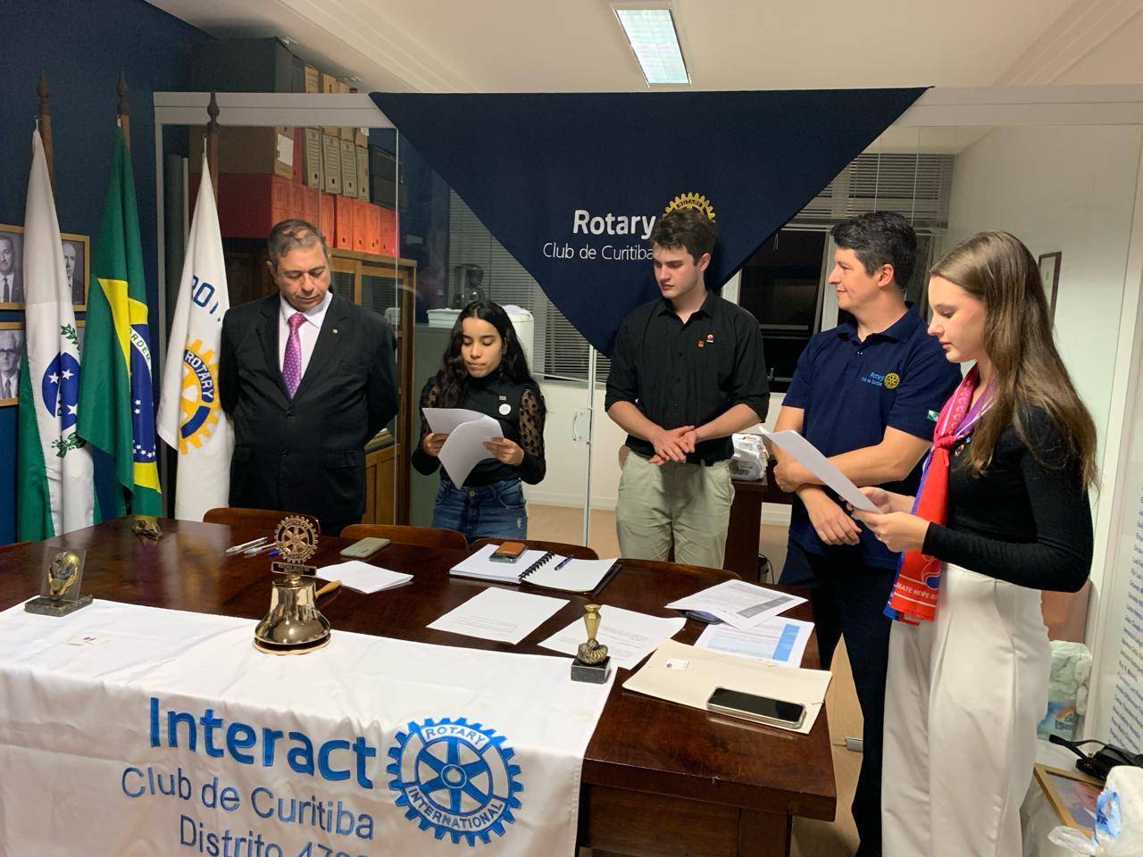 O Rotary Club de Curitiba, juntamente com o Distrito 4730, teve a alegria de empossar seus novos dirigentes interactianos nesta última sexta-feira, dia 03 de maio, às 18h30, em reunião realizada em sua Sede, localizada à Rua XV de Novembro, 362, conj. 603, que contou com a presença do Governador Laerzio Chiesorin Junior - D 4730 Rotary Internacional, do Presidente RCC 2023-24 Fabiano Reche dos Reis, Luiz Alberto da Cruz (GAD), da companheira Carla Regina Batista, Presidente da Comissão Juventude, companheiros e familiares que prestigiaram o festivo e relevante momento. Foram empossados: Luiza Cristine de Oliveira (Presidente), Danielle Vitória da Silva (Secretário), Gustavo Pires Tramuntinn (vice-Presidente). Ainda empossados: Sarah Weiand Nasser Costa e Sara Luz Cavalcanti, em breve nomeados para os demais cargos.