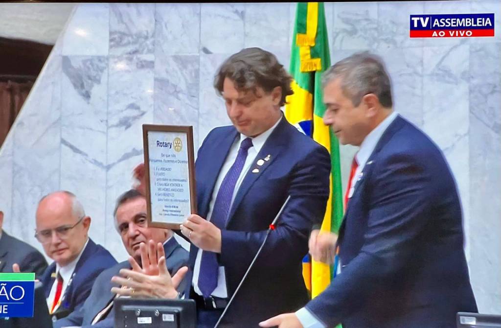 A convite do Presidente da Assembleia Legislativa do Estado do Paraná, Deputado ADEMAR LUIZ TRAIANO, para a Sessão Solene em comemoração ao "Dia do Rotariano Paranaense" (Lei n. 17.009/2011), por proposição do Deputado ANIBELLI NETO em parceria com o DISTRITO 4730 de ROTARY INTERNACIONAL, ocorrida em 26 de abril de 2024, às 18h00, no Plenário daquela Casa de Leis. A data registra os 91 anos de admissão do Rotary Club de Curitiba no Rotary Internacional (27 de abril de 1933). Participaram os Distritos 4730, 4630, 4640 e 4710.