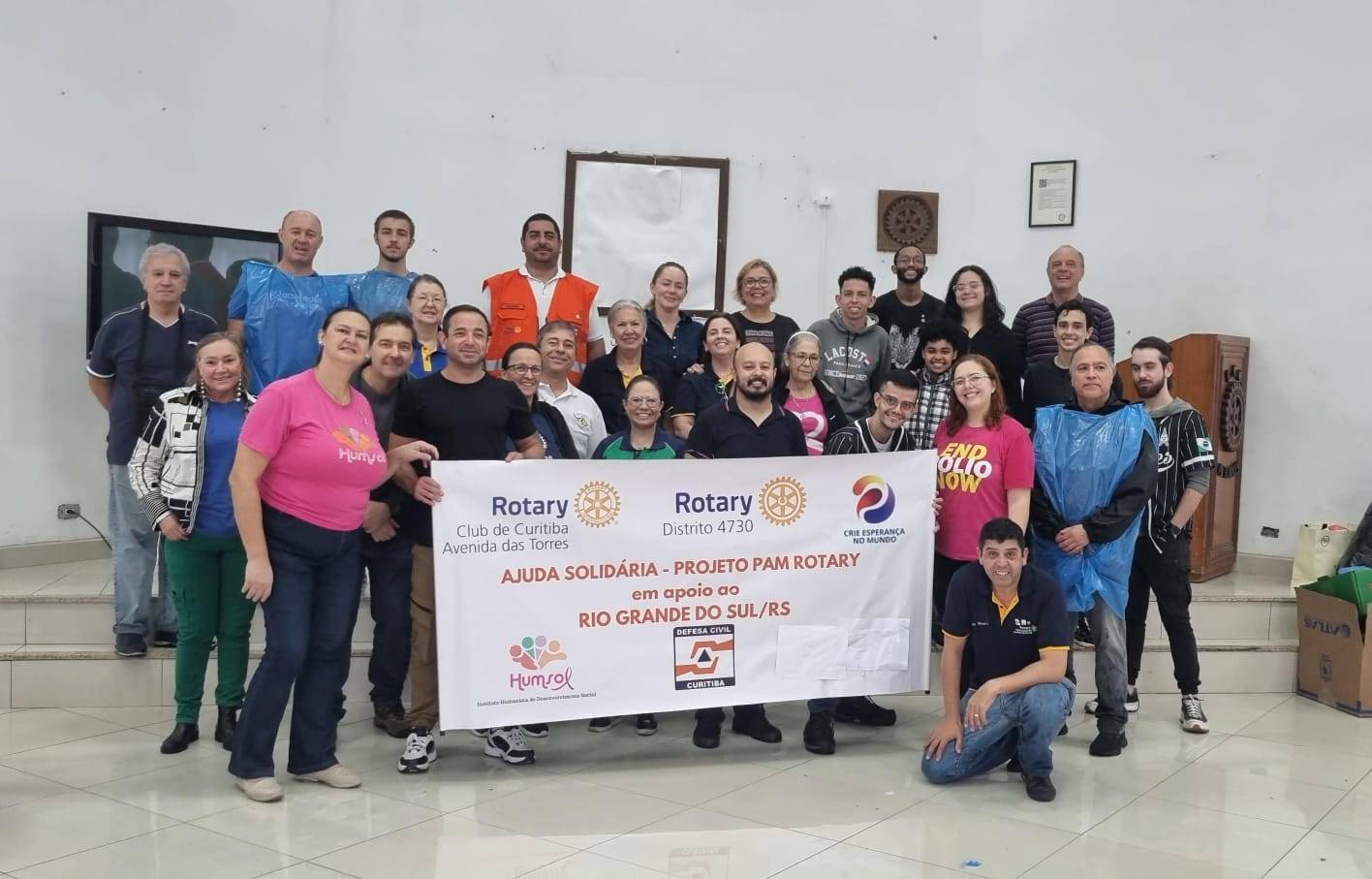 CAMPANHA DE ARRECADAÇÃO PARA AJUDA HUMANITÁRIA AO RIO GRANDE DO SUL – ENCHENTES E CHUVAS. PARCERIA RCC AVENIDA DAS TORRES E DEFESA CIVIL (Plano de Auxílio Mútuo (PAM) Rotary - Distrito 4730 RI). LOCAL: ARCA – Associação Rotária de Curitiba. Endereço: Rua Emanuel Klingbeil, 337, Boqueirão. O Rotary Club de Curitiba participou da logística neste sábado, dia 17 de maio, com as presenças do companheiro Demétrius Fernandes e seu filho Ricardo.