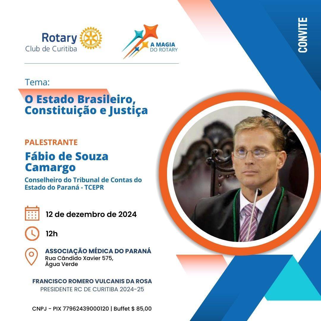 O Conselheiro do Tribunal de Contas do Estado do Paraná – TCE/PR, Fábio de Souza Camargo, que ocupou a presidência da corte de contas na gestão 2021-22 é o convidado e palestrante do Rotary Club de Curitiba e falará sobre – O Estado Brasileiro, Constituição e Justiça – na reunião do próximo dia 12 de dezembro (5ª feira), a partir das 12 horas com almoço na sede da Associação Médica do Paraná, no bairro Água Verde, em Curitiba.