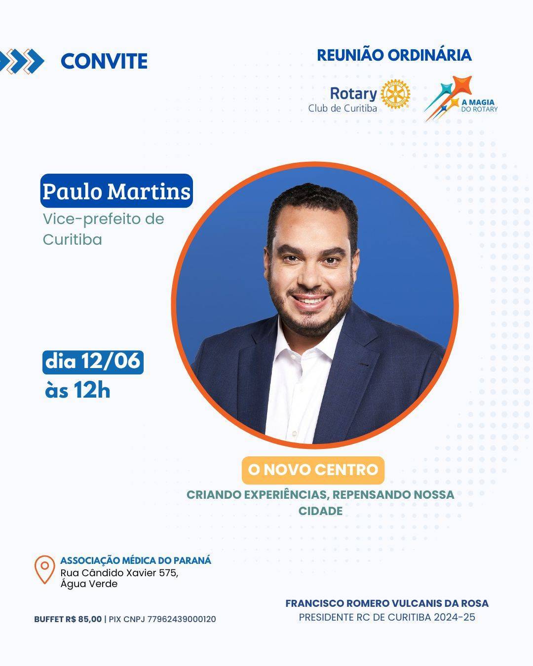 O Rotary Club de Curitiba sob a presidência do empresário Francisco Romero convida para a 43ª reunião ordinária no próximo dia 12 de junho (5ª feira), a partir das 12 horas com almoço por adesão, na sede da Associação Médica do Paraná, que contará com a presença do Vice-Prefeito e Secretário Municipal de Desenvolvimento Econômico e Inovação de Curitiba, Paulo Martins que fará uma palestra sobre o - Novo Centro: Criando Experiências, Repensando Nossa Cidade -.