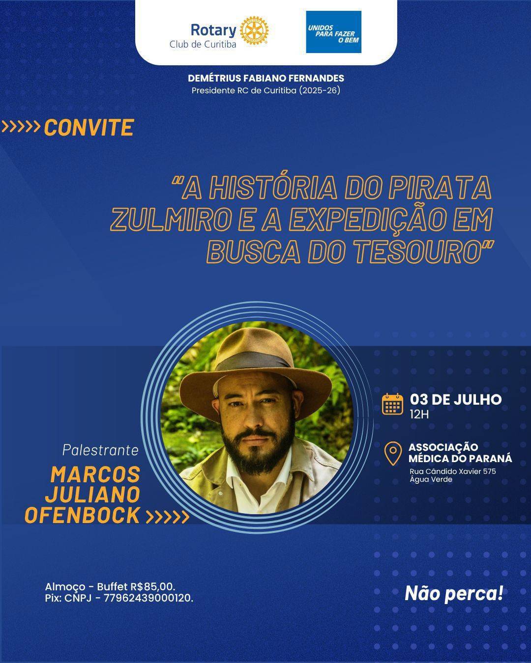 O Rotary Club de Curitiba recebe no próximo dia 3 de julho (5ª feira), a partir das 12 horas, com almoço na sede da Associação Médica do Paraná o empresário Marcos Juliano Ofenbock, escritor, economista e diretor no Instituto Histórico e Geográfico do Paraná (IHGPR), que fará uma palestra narrando - A HISTÓRIA DO PIRATA ZULMIRO E A EXPEDIÇÃO EM BUSCA DO TESOURO - . O evento marca a primeira reunião do ano rotário 2025-2026 sob a presidência do Consultor de Soluções Imobiliárias, Demétrius Fabiano Fernandes.