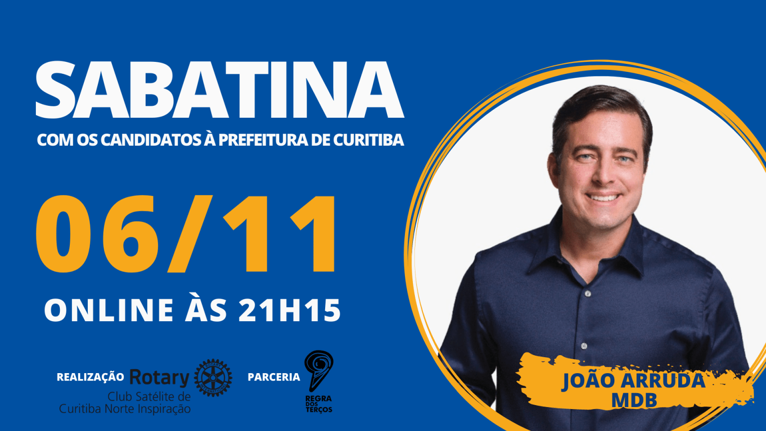 O Rotary Club Satélite de Curitiba Norte Inspiração, em parceria com o Regra dos Terços, promoveu nesta sexta-feira (6), às 20h15, uma sabatina com João Arruda, candidato à prefeitura de Curitiba pela MDB.