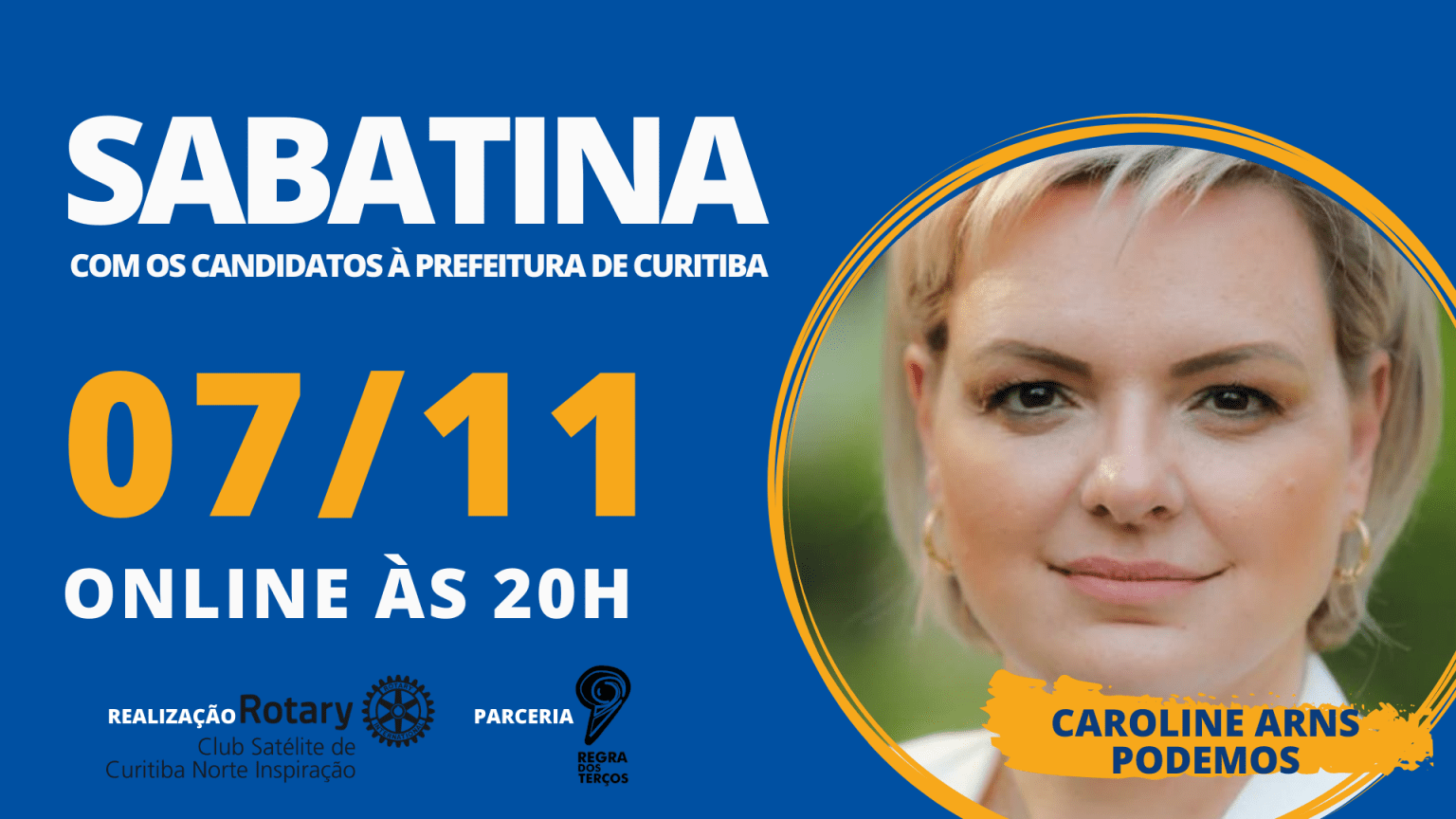 O Rotary Club Satélite de Curitiba Norte Inspiração, em parceria com o Regra dos Terços, promoveu neste sábado (7), às 20h, uma sabatina com Caroline Arns, candidata à prefeitura de Curitiba pelo Podemos.