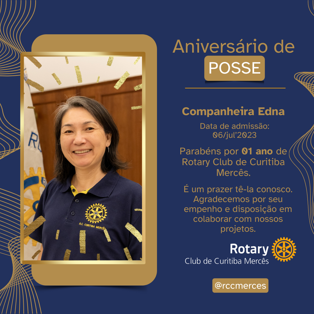 Parabéns, Edna! 🎉 No último sábado celebramos 1 ano da sua jornada no Rotary Club de Curitiba Mercês. Sua dedicação e comprometimento inspiram a todos nós!