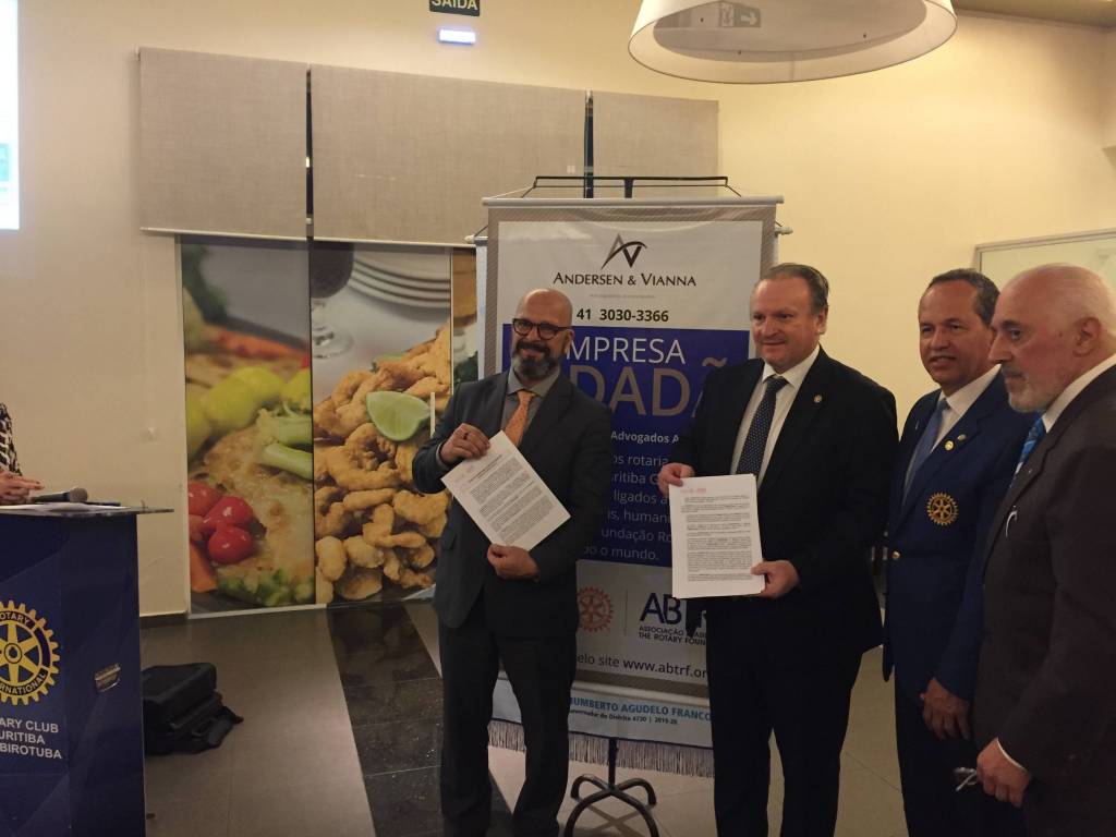 Com início as 20:30 horas aconteceu a Reunião Festiva quando o governador teve a oportunidade de acompanhar a assinatura do Termo de Compromisso da primeira Empresa Cidadã (Programa da ABTRF) parceira do RCC Guabirotuba, ANDERSEN & VIANNA – Advogados Associados que foi representada pelos Sr.(s) Dirceu Andersen e Gabriel Vianna.