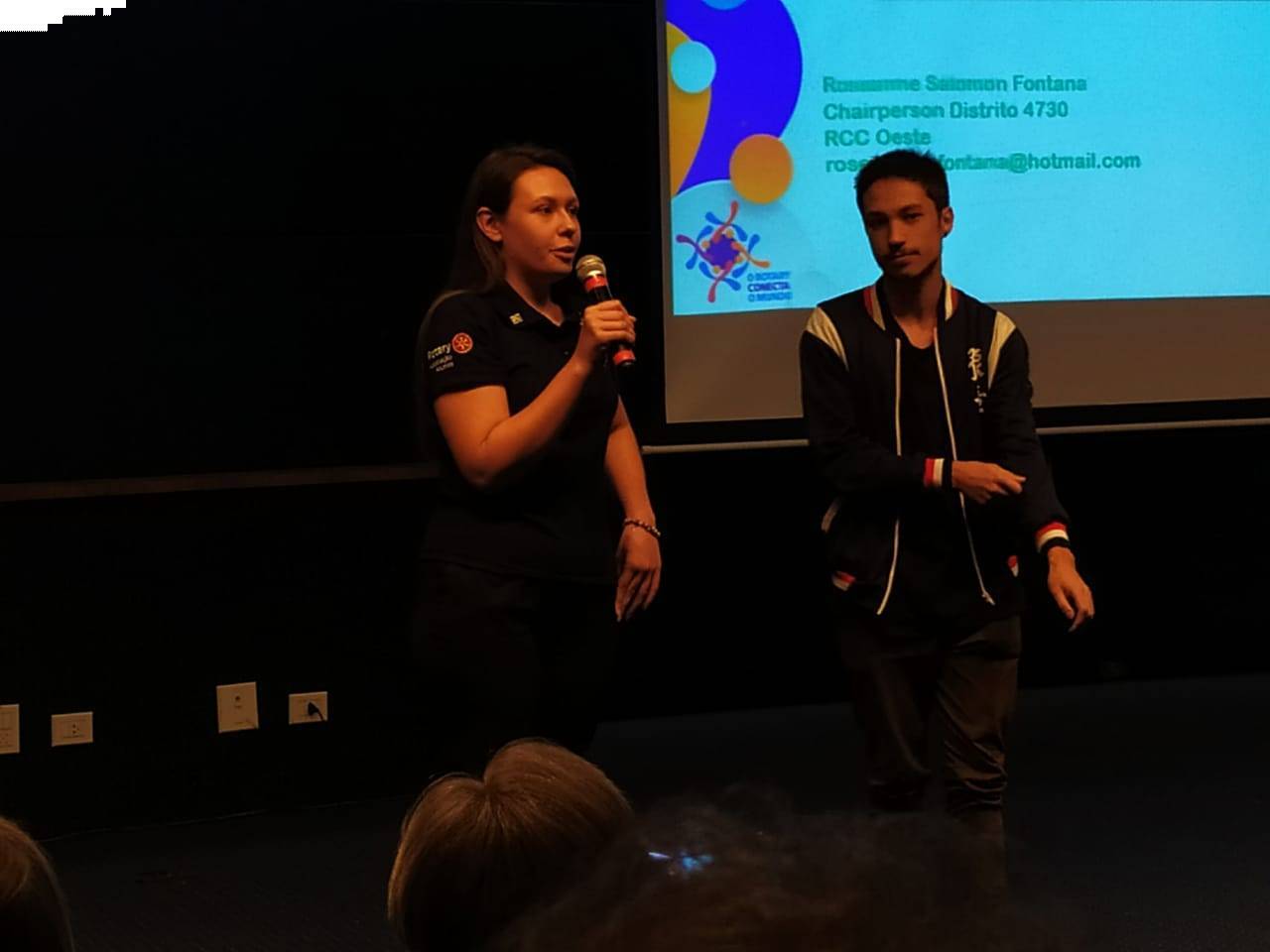 Jovens do RCC de Curitiba Cidade Ecológica, Thaís Guimaraes e Miguel Gasparetto Filho, dando seu depoimento de intercambistas e agora Rotex , para pais nervosos em ficar um ano longe de seus filhos. Uma palavra que orienta e acalenta.