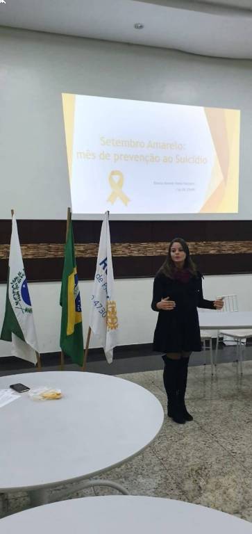 "SETEMBRO AMARELO E SEUS SINAIS " da psicóloga Bianca M. Vieira Palmier ! Profissional atuante justo na área de prevenção ao suicídio falou clara e didaticamente sobre as faixas mais vulneráveis : jovens adolescentes e pessoas idosas deprimidas. Foi uma Palestra impactante e esclarecedora! Contamos também com a participação da ala jovem do clube em nossa reunião ,representantes do Rotaract, Interact e Rotary Kids .
