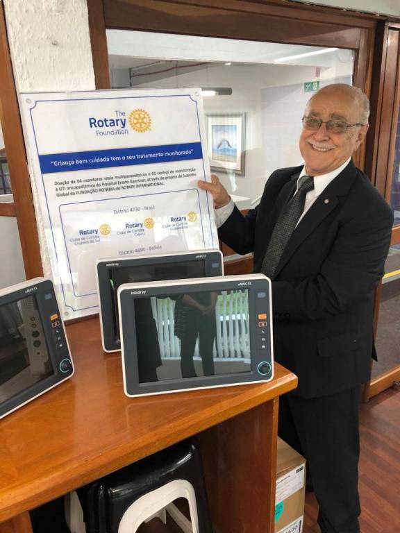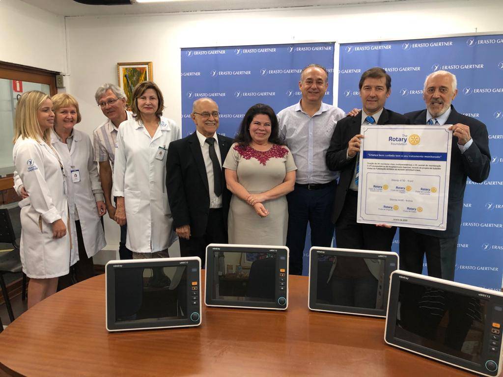 Representando o Rotary Club de Curitiba Guabirotuba, os companheiros Presidente Juarez Fernando Gaziri, o associado Francisco Borsari Netto e o associado Honorário Gerson Honório Alves participaram da entrega de 04 monitores vitais multiparamétricos e 01 central de monitoramento à UTI oncopediátrica do Hospital Erasto Gaertner.
