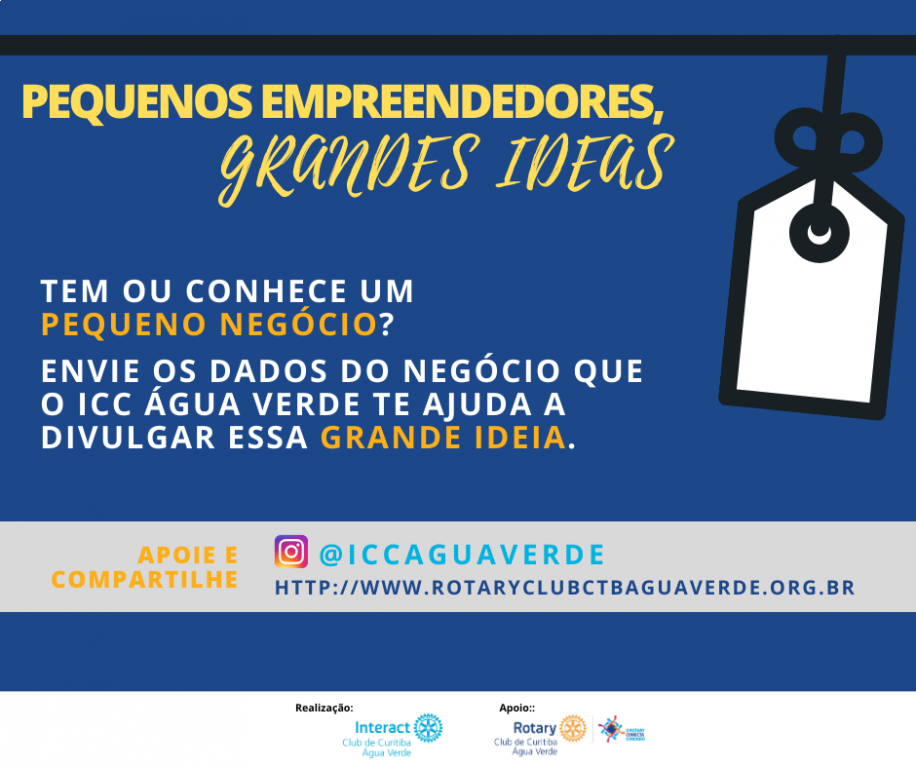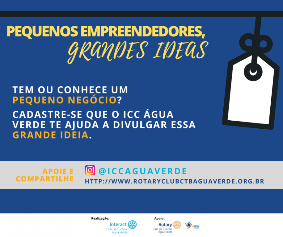 Pensando nisso, o ICC Água Verde lança o projeto "Pequenos Empreendedores, Grandes Ideas", que visa divulgar e compartilhar os micro e pequenos negócios, principalmente os da comunidade, que tanto necessitam de fôlego para passar por essa pandemia.