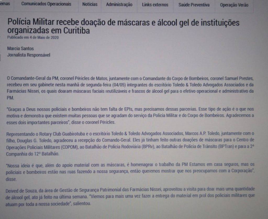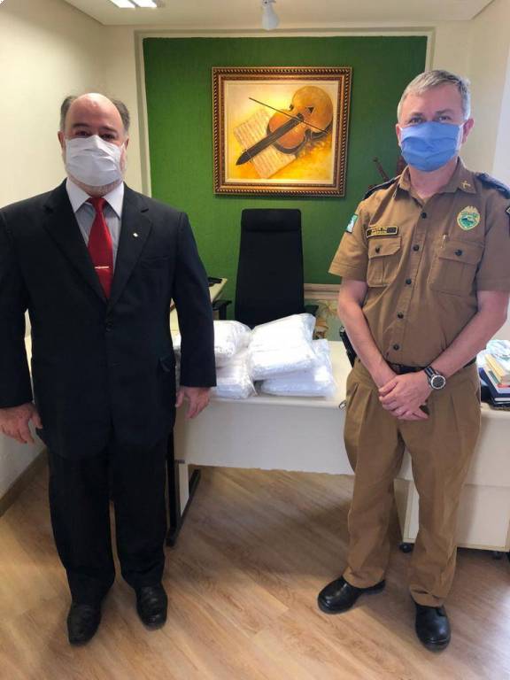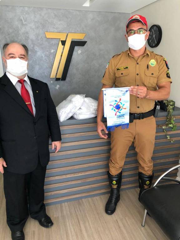 Na data de 30 de abril e 04 de maio, no programa Pessoas em Ação do Rotary Contra a Covid-19, foram entregues 1000 máscaras de proteção ao Comando da Polícia Militar do Paraná. Em parceria com a Toledo e Toledo Advogados Associados, Lojas Maçônicas Cavaleiros de Aço e o Rotary Club de Curitiba Guabirotua também foi possível a doação de máscaras de tecido reutilizável ao BPRV, ao 12º Batalhão, a Assessoria do TRE, ao COPOM e comando Geral. O objetivo da ação foi “Ajudar na proteção de quem trabalha nos Protegendo Sempre”, como afirmou nosso parceiro Marcos Toledo que foi acompanhado para a entrega das doações pelos companheiros Juarez Fernando Gaziri e Laerzio Chiesorin Junior.